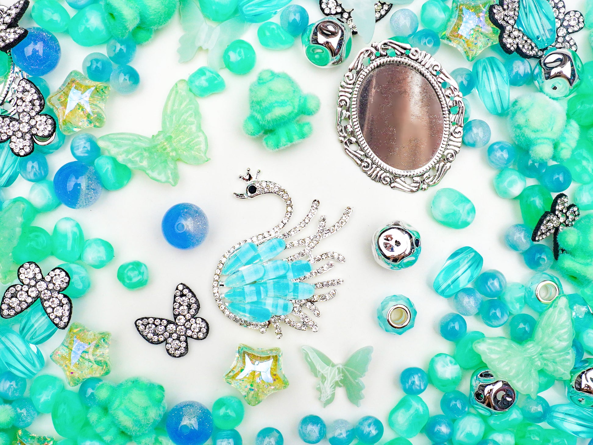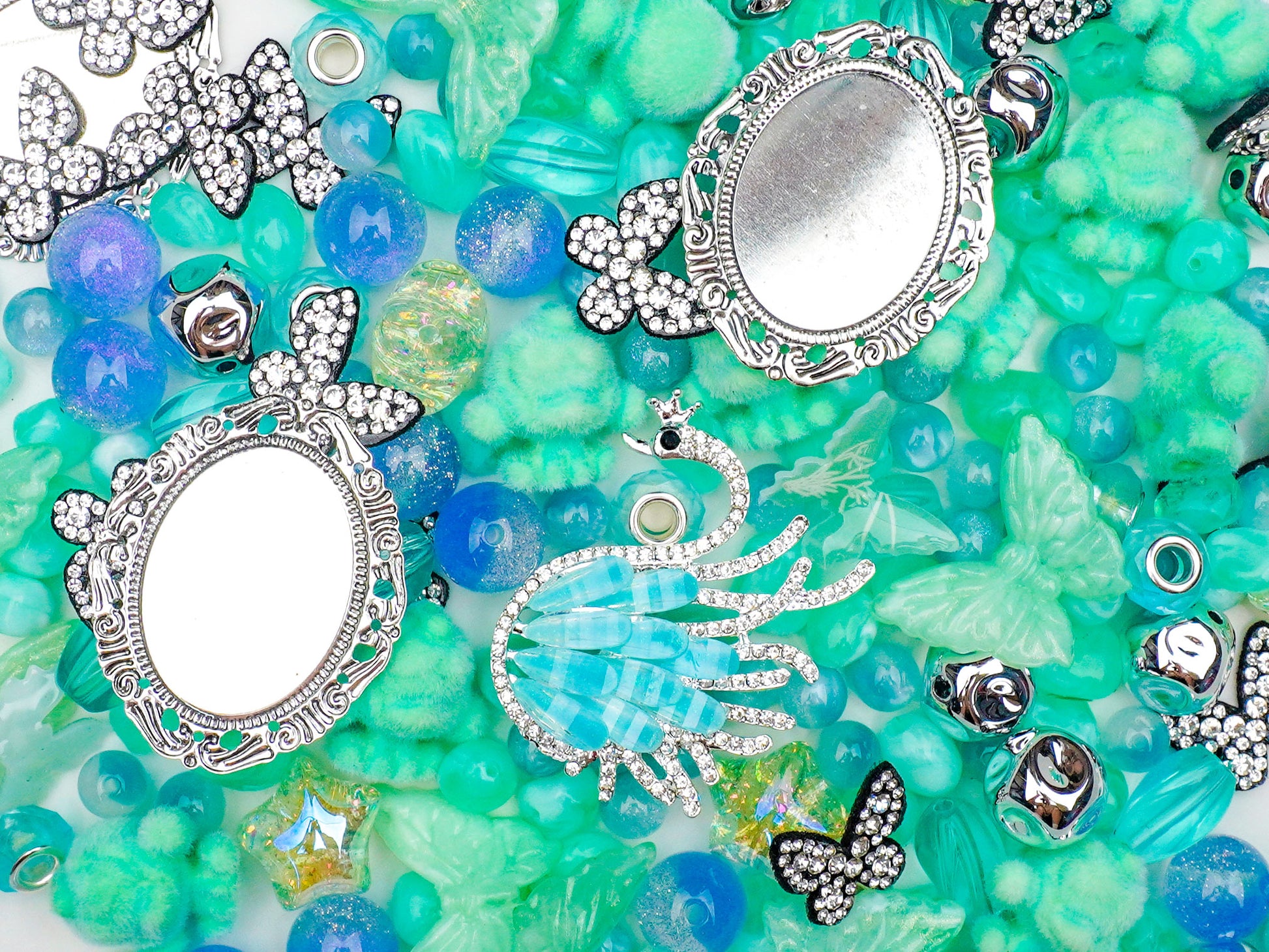 Surrounding it are frosted butterflies, glossy beads, shimmering star accents, and an ornate silver mirror charm that brings a touch of royal nostalgia. The blend of translucent blues and mint greens creates a serene, water-light glow perfect for crafting jewelry that feels magical and ethereal.