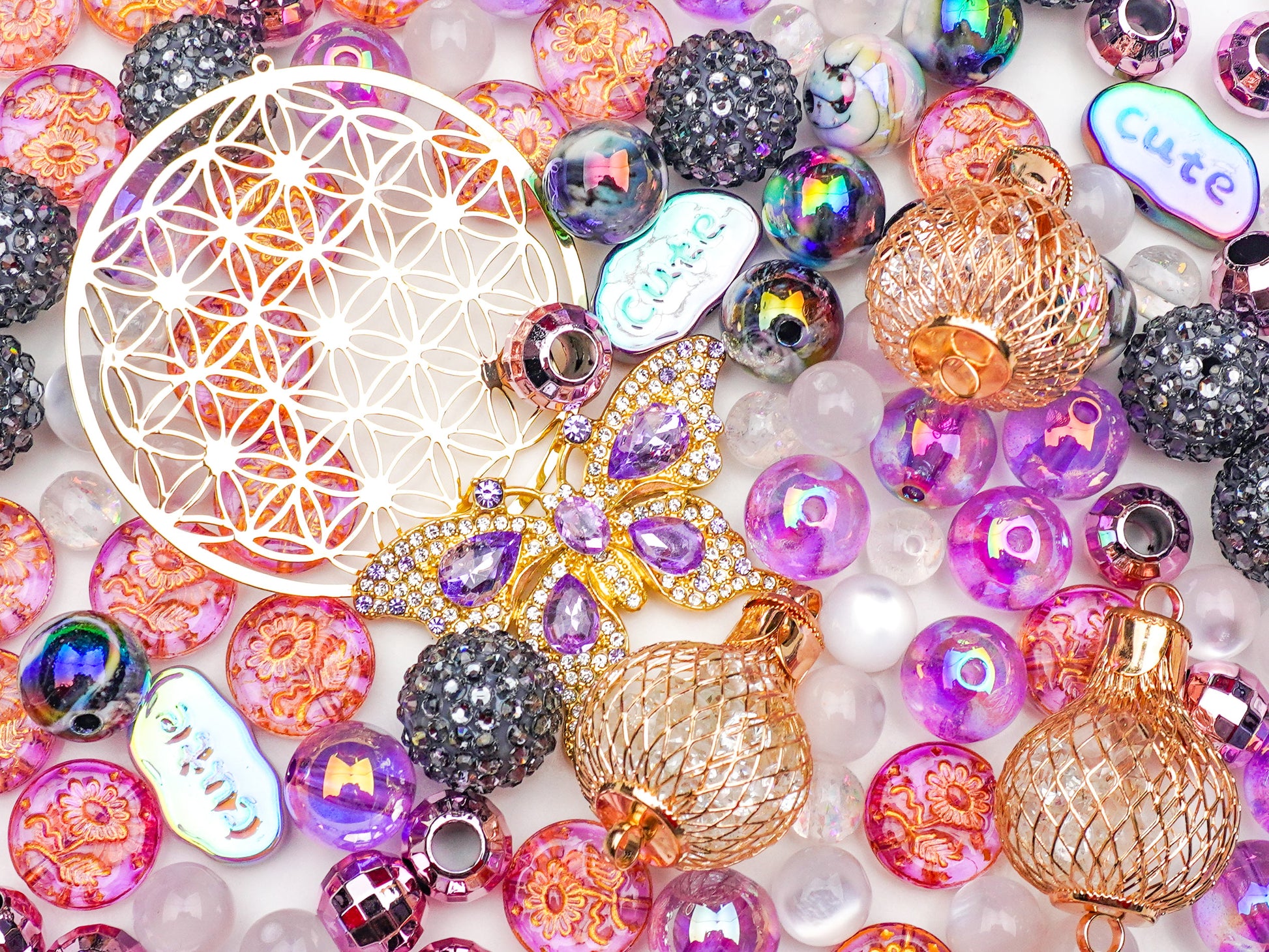 Step into a dreamy vintage-meets-cosmic fantasy with Cosmic Butterfly, a charm mix glowing in soft purples, warm peach tones, iridescent finishes, and golden details. At the center, a sparkling butterfly charm spreads its crystal-studded wings, surrounded by galaxy-like beads, floral discs, metallic accents, and “cute” pastel charms that feel straight out of a retro star-lit night. ✨🦋