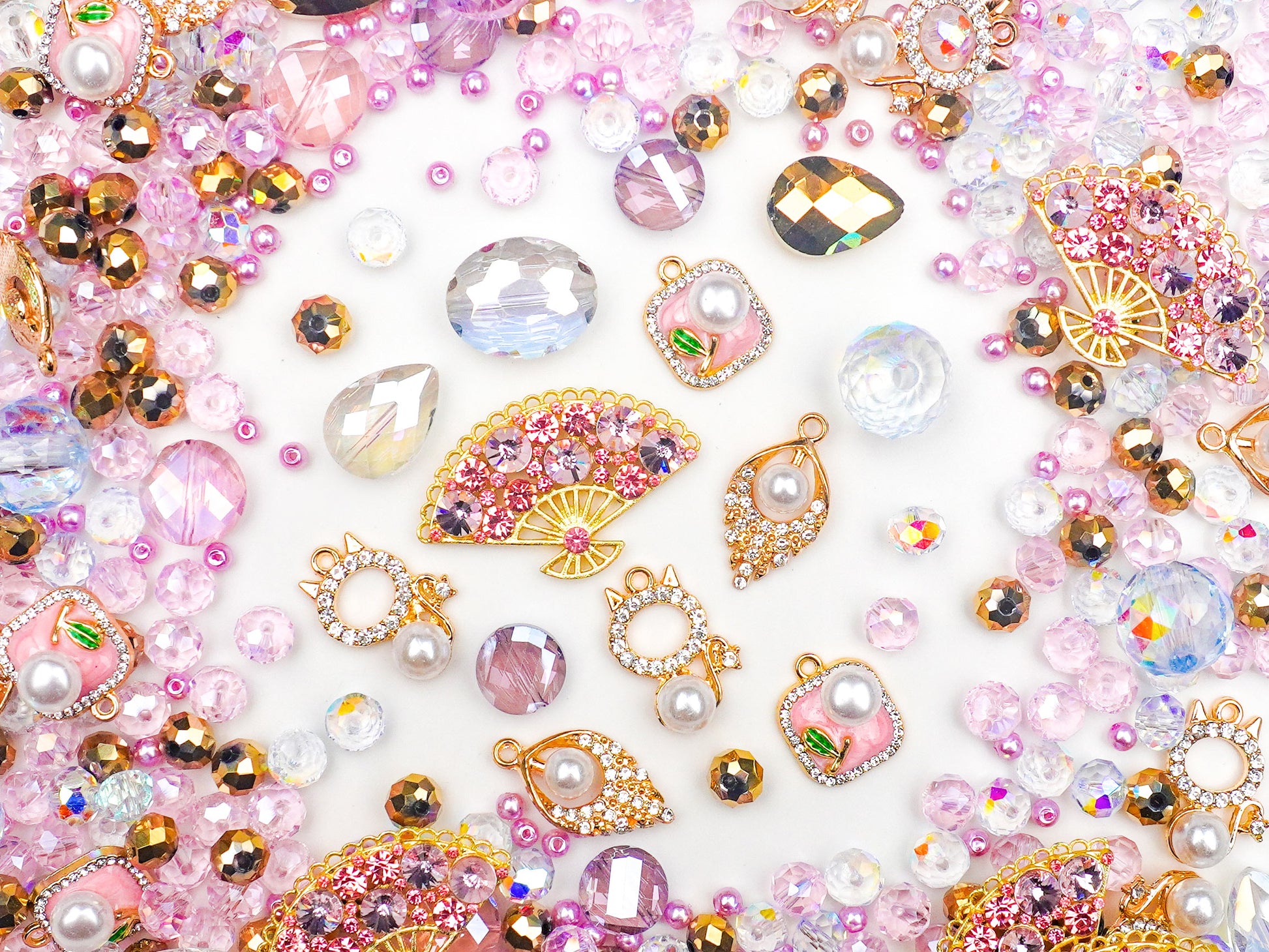 Graceful, delicate, and shimmering — Fan Dance captures the timeless elegance of a waltz under soft pink lights. This mix dazzles with pastel crystals, golden fans, and pearl-adorned charms that evoke vintage beauty with a hint of playful glamour. Each piece feels like a movement in an old ballroom, full of grace and charm. 🌸💎