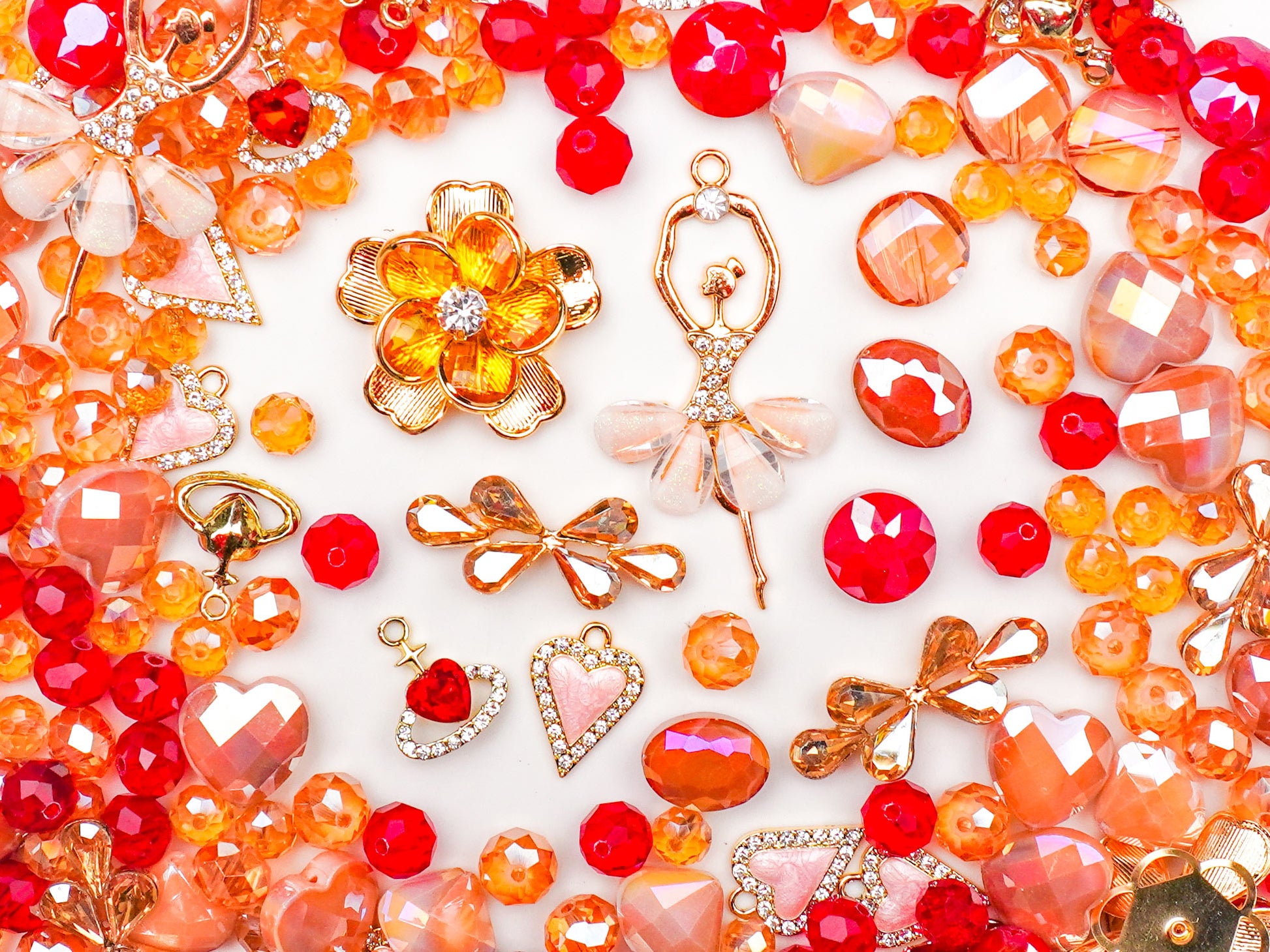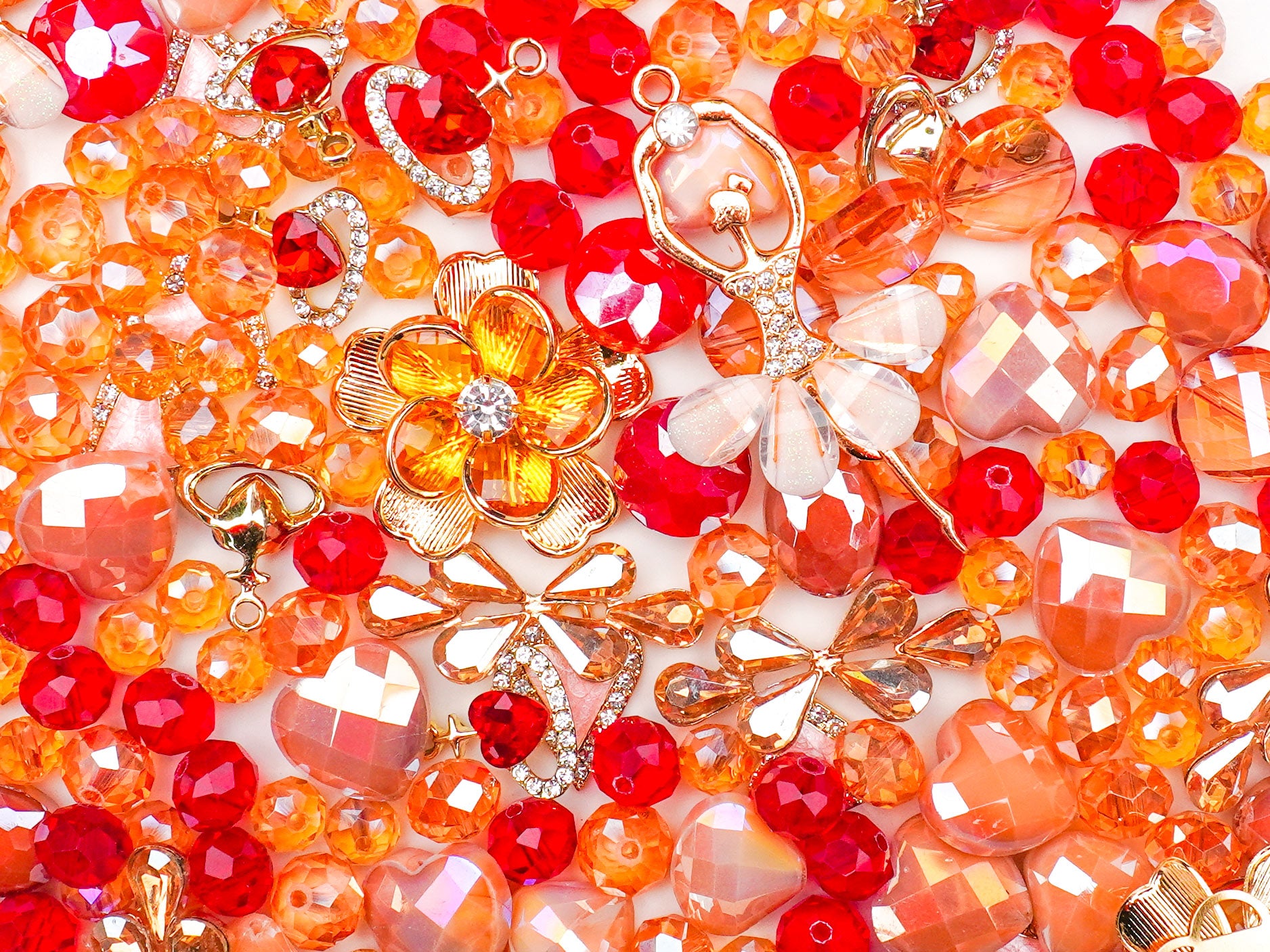 Each element feels alive — from the soft shimmer of peach beads to the fiery glow of ruby gems, every piece moves with rhythm and warmth. The mix beautifully balances sophistication and playfulness, making it perfect for crafting accessories that dance with personality.