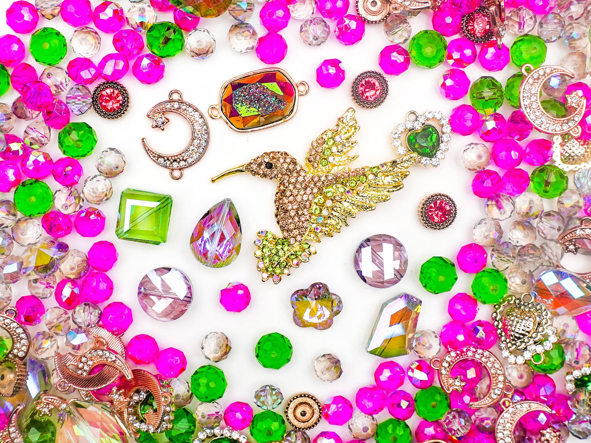 Get a taste of summer with our Watermelon Crush collection! 🍉✨ This mix is a juicy explosion of electric pink and lime green crystals, serving total Y2K nostalgia. We are obsessed with the stunning jeweled hummingbird centerpiece and the dreamy celestial moon charms that add a magical touch to the tropical vibes.