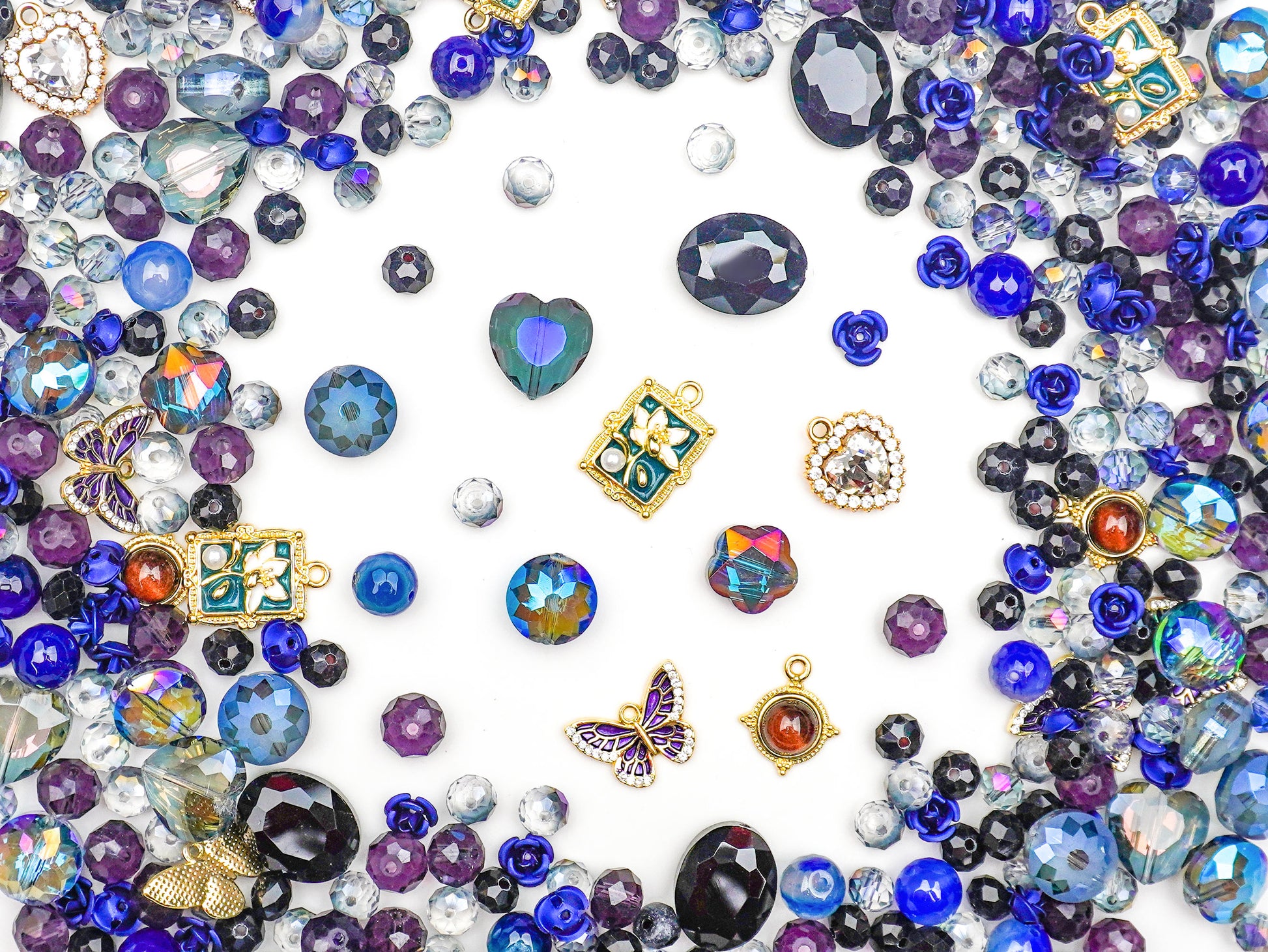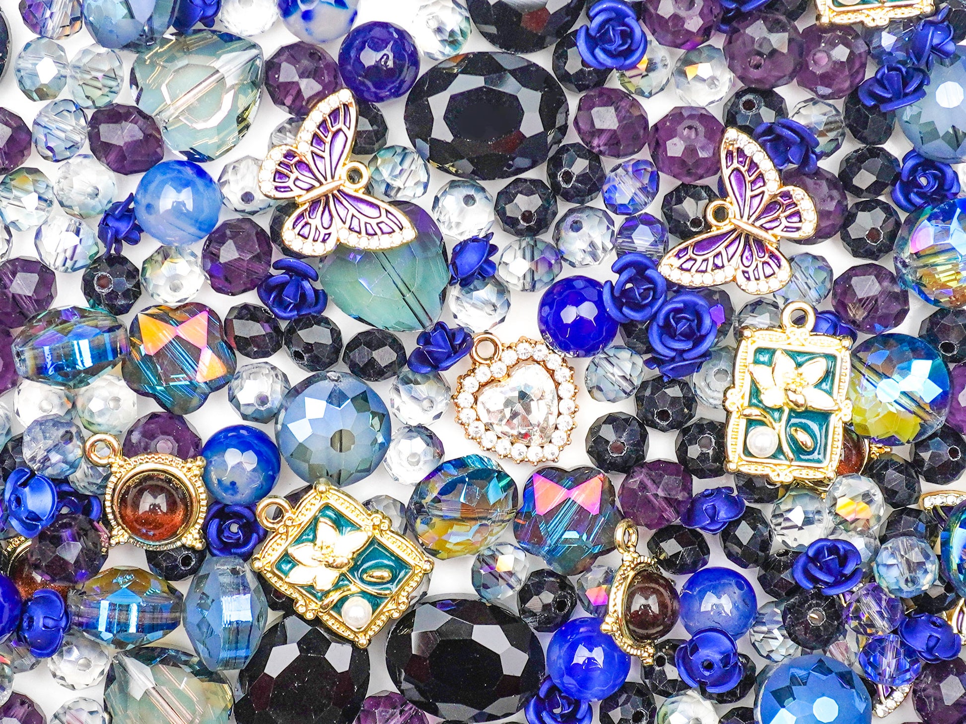 Step into a world of deep elegance with Mysterious Heir, a vintage-inspired charm mix built around midnight blues, royal purples, oil-sheen greens, and antique gold details. The scene feels like uncovering an old noble family’s treasure box—full of faceted beads, gem-cut hearts, tiny framed pendants, and mystical butterfly charms that shimmer with every angle. 🦋✨