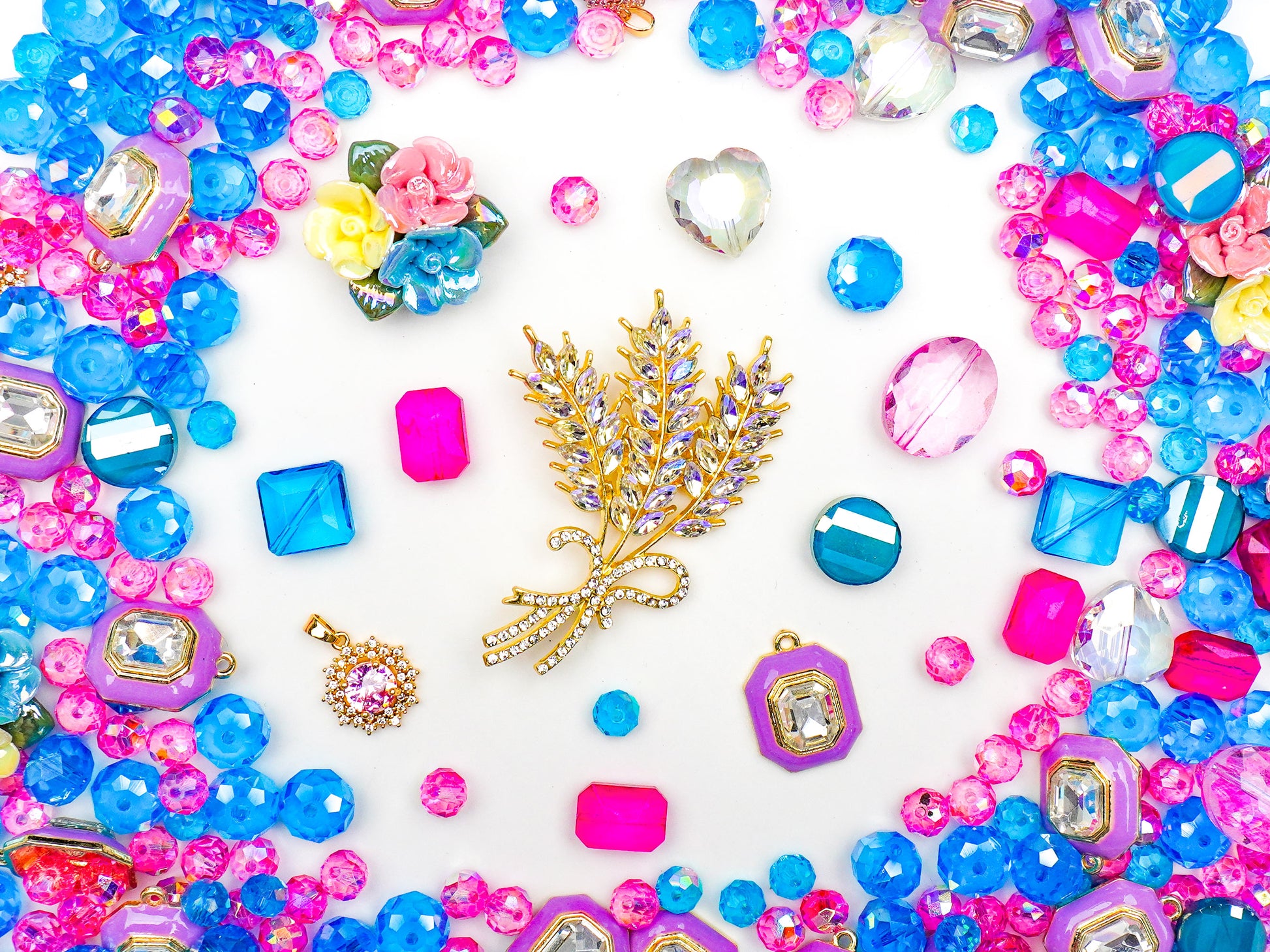 In the center, the elegant wheat-style brooch shines with tiny crystals, giving off that glamorous “old Hollywood garden party” vibe. Around it, you’ll find floral charms, heart gems, glossy round beads, faceted pastel jewels, and retro octagon stones—perfect for earrings, bracelets, bag charms or a one-of-a-kind necklace.