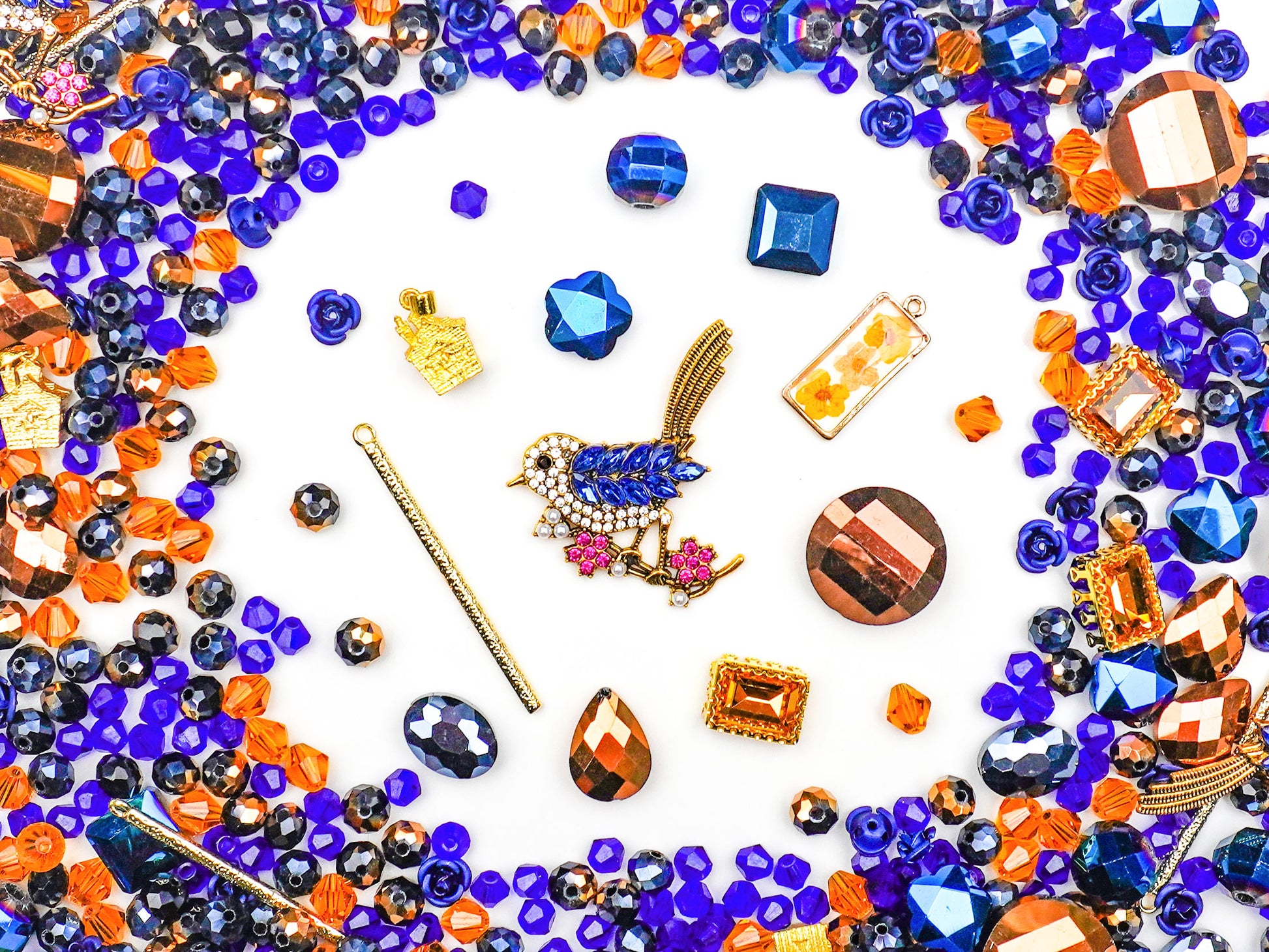 “Homebound” brings together a cozy, story-rich palette of deep sapphire blues, warm amber oranges, and shimmering vintage gold. At the center, a charming little blue bird charm sits like a symbol of returning home, surrounded by tiny house silhouettes, faceted gems, and retro-styled pieces that feel straight out of an old storybook. 🕊️✨
