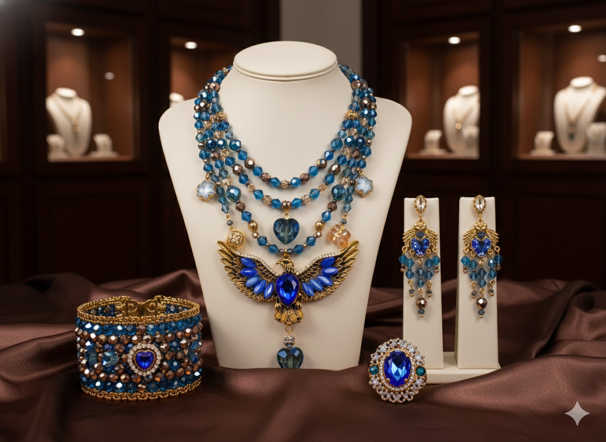 The rich combo of electric blue crystals, antique bronze beads, and amber accents serves major retro-glam looks. 🤎🌟 Featuring sparkling stars and gold-rimmed hearts, it’s giving bold, independent, and unapologetically free vibes—perfect for the wild at heart. 🛣️🔥