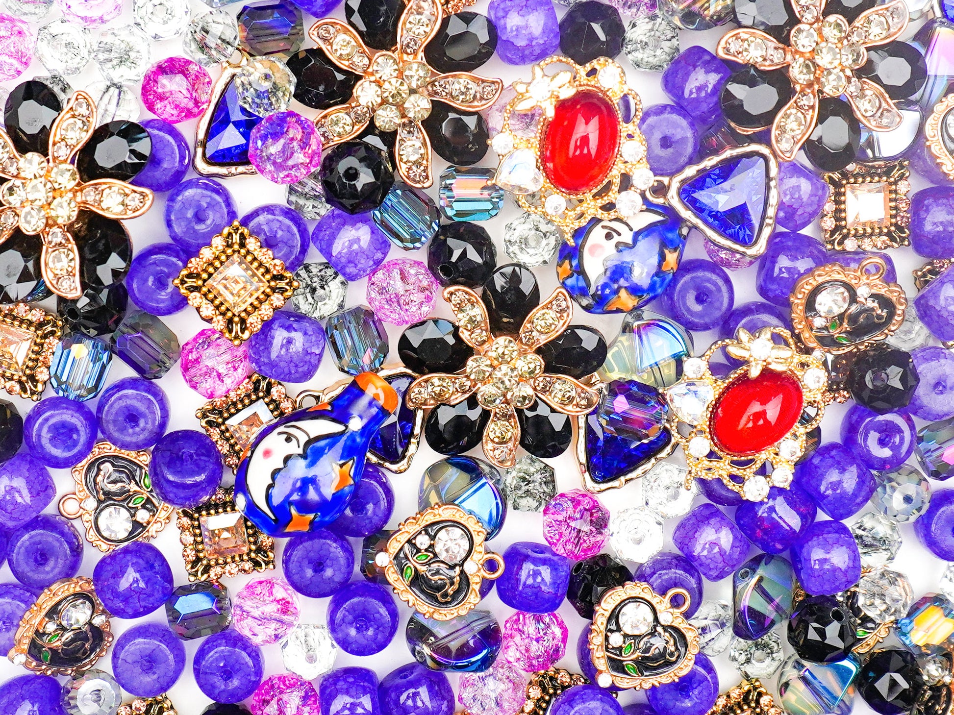We are literally obsessed with the details—peep those goth-glam black flower charms and the mystical moon-face bottle! 🌙✨ Paired with shimmering crackle beads and ornate geometric gems, every piece feels like a hidden treasure waiting to be styled.