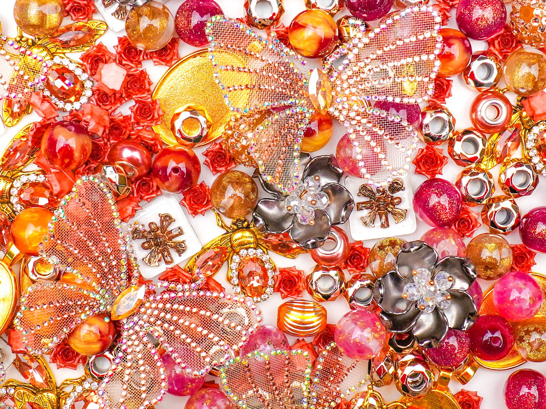 The mix blends shimmering oranges with regal golds and soft pinks, evoking a feeling of luxury and creativity. The detailed lace butterflies and jeweled florals add that old-world sophistication, while the glossy beads bring playful vibrance. It’s the perfect balance of warmth and grace.