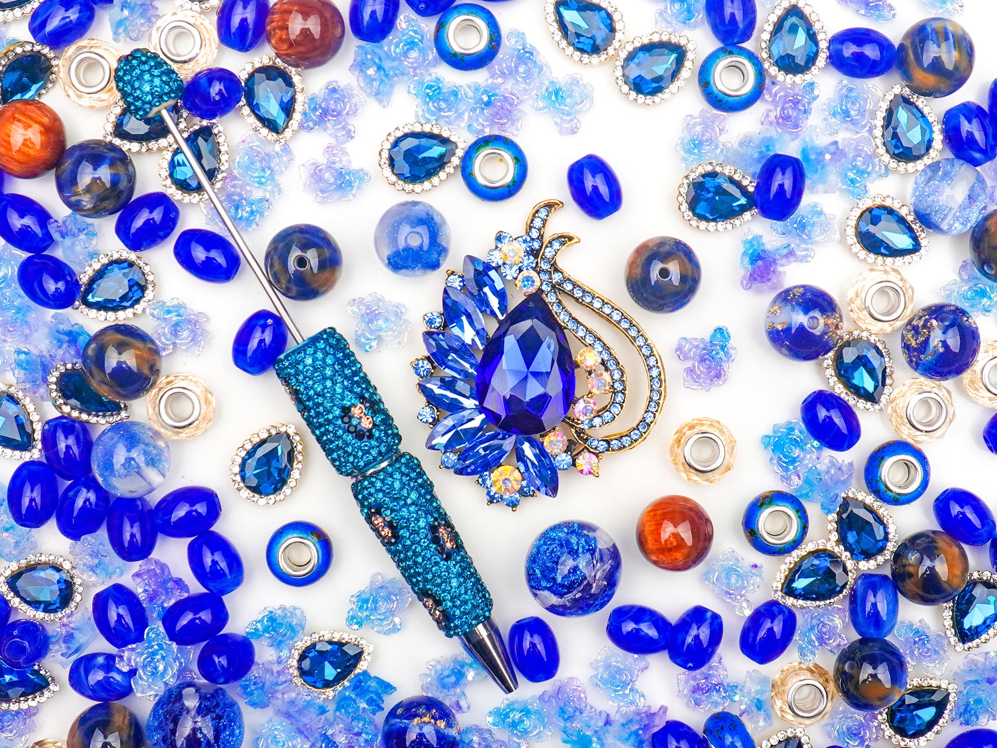 Elegant, timeless, and deeply captivating — Bluebird Waltz captures the beauty of twilight skies in motion. This mix blends sapphire blues, shimmering silvers, and warm amber tones, echoing the grace of a bluebird gliding through golden evening light. The centerpiece charm, a radiant peacock-inspired jewel, sparkles with vintage allure and regal energy. 🪶💎