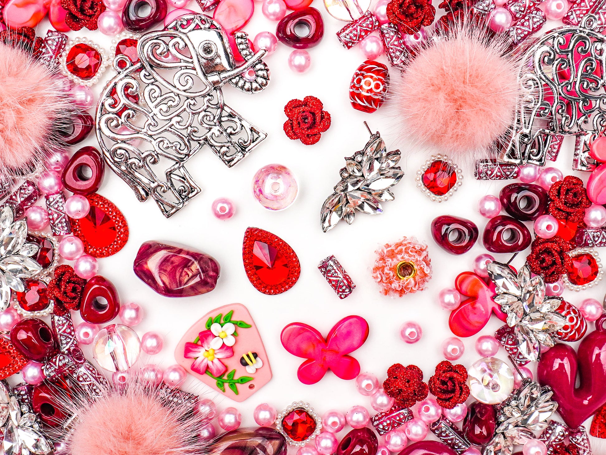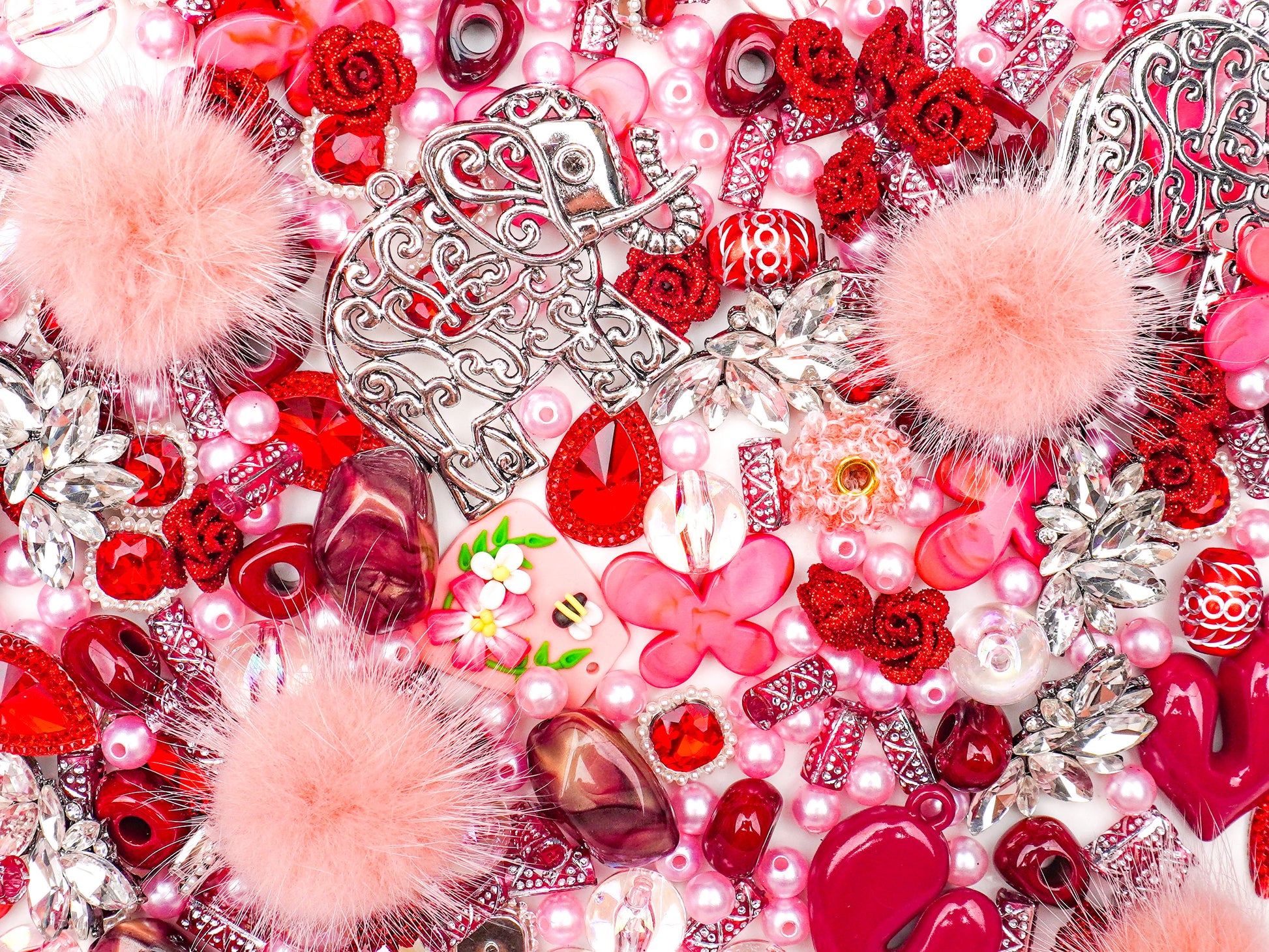 This mix balances playful textures like fuzzy pom-poms and glossy hearts with regal crystal accents and rose details. It’s sweet, mysterious, and timeless — like a keepsake from another era, rediscovered to spark new creativity. 💖🐘